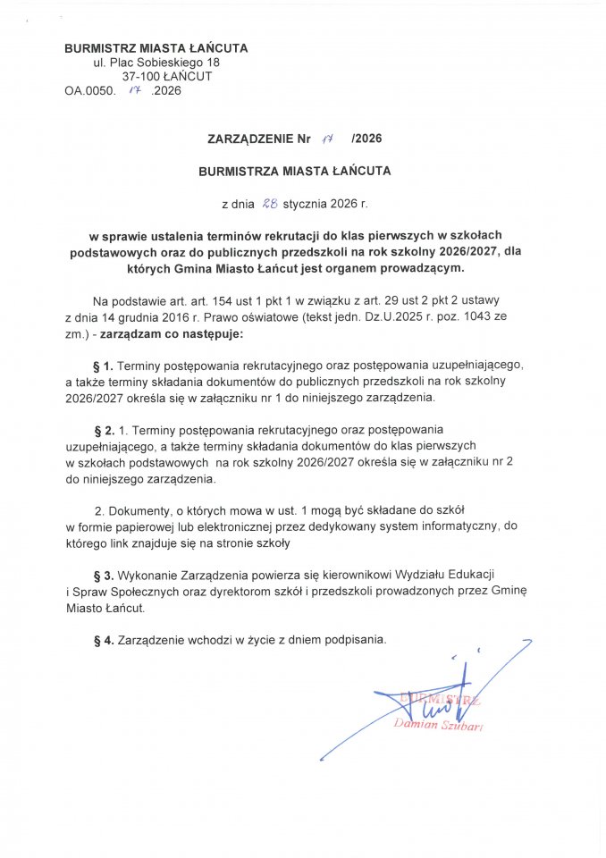 Uchwała nr XXXV/224/2021 Rady Miasta Łańcuta z dnia 28 stycznia 2021 r. w sprawie zmiany uchwały nr XXXIX/260/2018 Rady Miasta Łańcuta z dnia 15 lutego 2018 r. w sprawie określenia kryteriów w postępowaniu rekrutacyjnym do klas pierwszych szkół podstawowych, dla których organem prowadzącym jest Miasto Łańcut oraz dokumentów niezbędnych do potwierdzenia tych kryteriów.